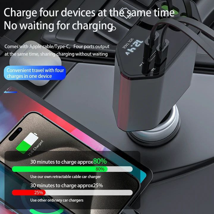 شارژر فندکی فست شارژ 4 منظوره دارای صفحه دیجیتالی و میتونید همزمان هم گوشی , تبلت . آیپاد خود را شارژ کنید دارای 2 عدد کابل 80 سانتیمتری برای آیفون و تایپ C می باشد