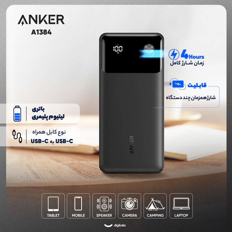 پاوربانک 30 وات انکر مدل A1384 ظرفیت 20000 میلی آمپر ساعت به همراه کابل USB-C